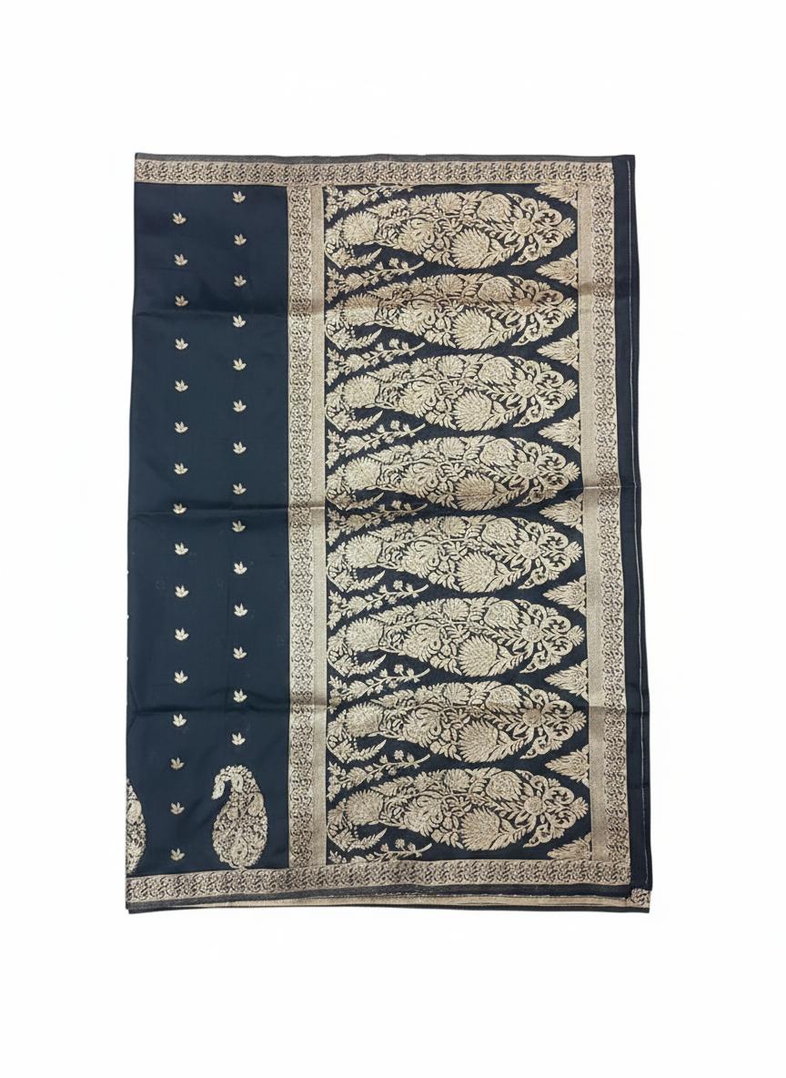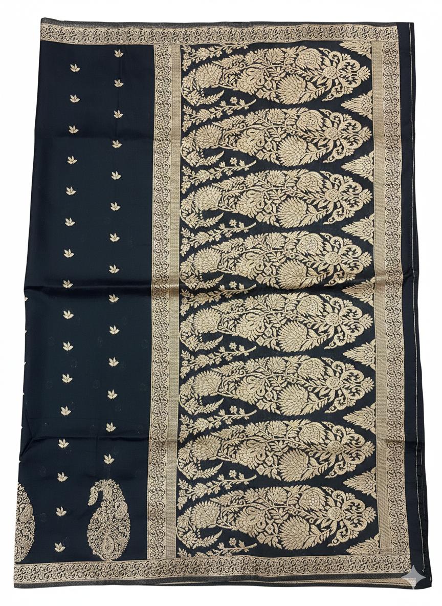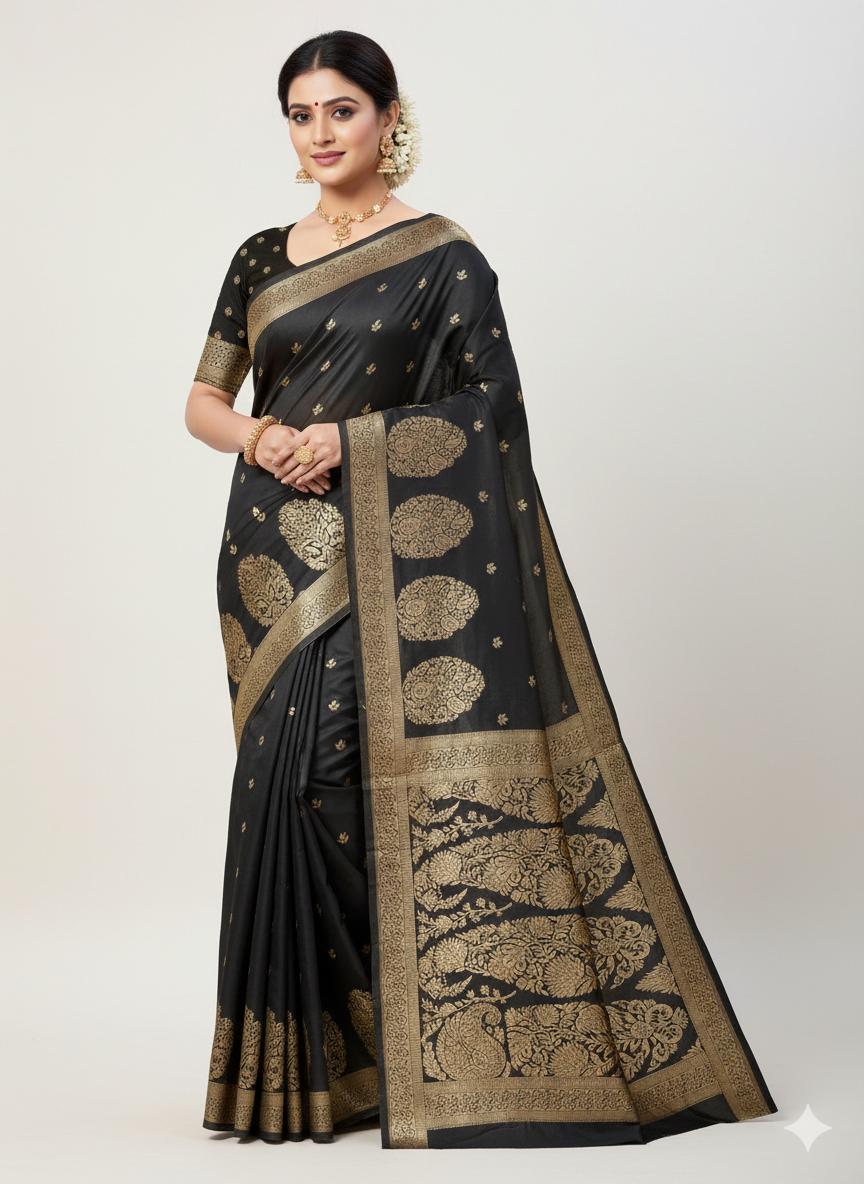 Step into elegance with this stunning Soft Silk Saree beautifully designed with rich golden zari work. The deep black base enhances the intricate golden mango (paisley) motifs, giving it a grand and traditional look.